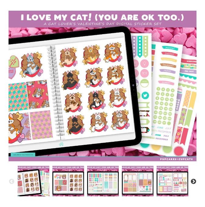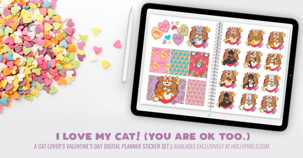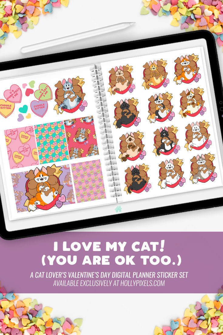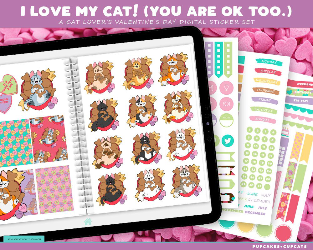 Adorable original cat themed, 400+ piece digital planner sticker set from concept to completion for Holly Pixels’ vendor shop.